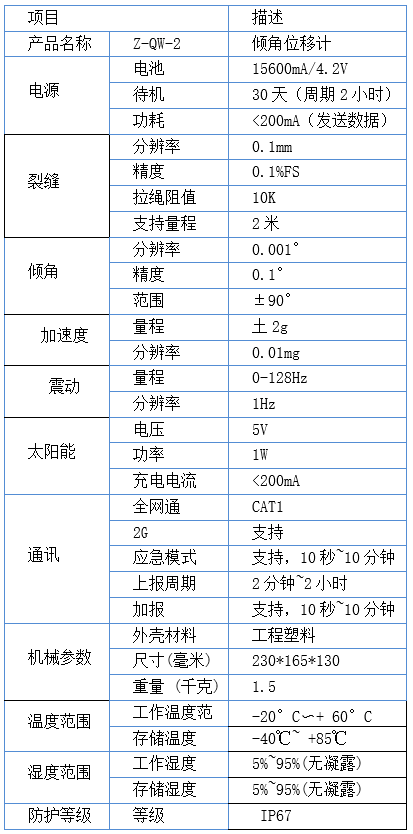 Z-QW-2型倾角位移计适用于岩石崩塌、地面裂缝、墙体裂缝等地质灾害的监测,该产品采用无线一体化设计,将倾角和拉绳位移集成到一起,采用太阳能板供电,内置锂电池,在保证设备工作供电的需求。