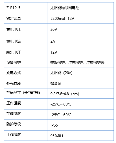 Z-B12-5型太阳能物联网电池是一款可太阳能充电的物联网设备专用电池,设备采用金属外壳达到高安全、高可靠的要求,接口采用防水对接连接器,连接快捷安全可靠。